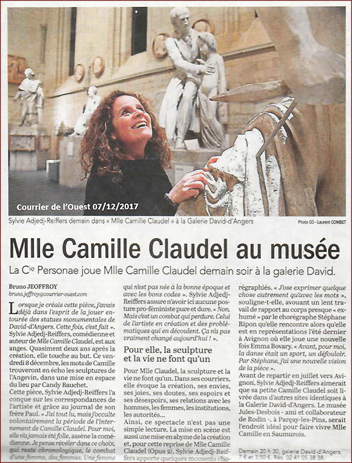 Et quoi de mieux pour relater la vie d’une artiste que de la mettre en scène en plein cœur d’un musée? C’est entre les statues de David D’Angers, dans la Galerie du même nom, que la comédienne Sylvie Adjedj-Reiffers a prêté son corps et sa voix à cette artiste incomprise, élève et amante d’Auguste Rodin, dont les œuvres commencent à acquérir une notoriété méritée. Seule en scène, la comédienne s’empare des lettres de Camille, de son frère, de Rodin et de ses amis, interprète leurs mots tout en sensibilité, ne tombant jamais dans le piège de la lecture ou de la récitation pure et simple. Rien de robotique ici, que de l’émotion.